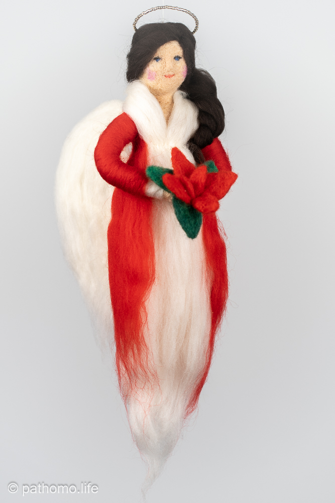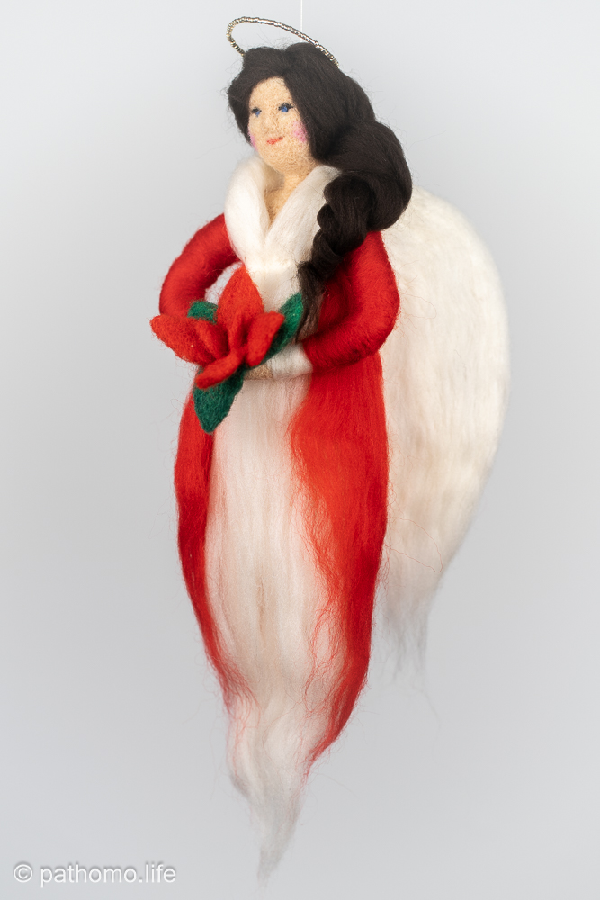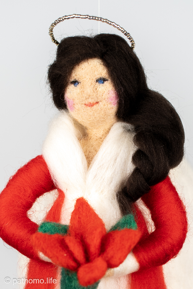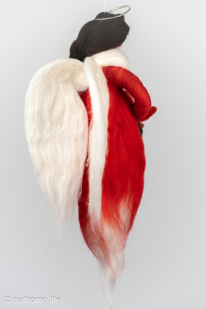 Our angels are crafted from natural merino wool sourced from certified farms in Europe. The wool is a pure natural product and is not chemically treated. Its coloring meets the standards of the textile industry.